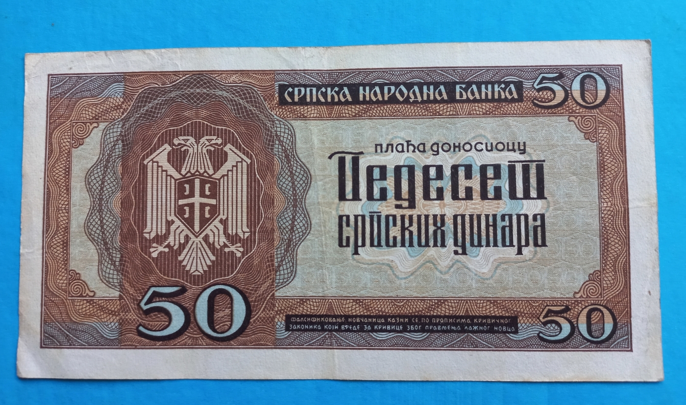 Genuine 50 Dinara banknote 1942 WW II German Occupation of Serbia fine con !