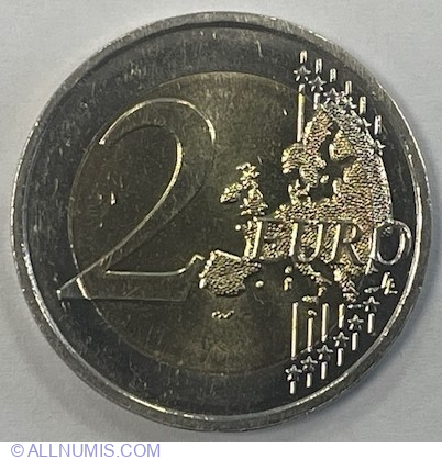 | Descriere avers | În partea stângă, numeralul 2 care indică valoarea nominală; în dreapta se află şase linii paralele verticale; aproape de fiecare dintre extremităţile liniilor apare câte o stea care înterupe linia - în total sunt douăsprezece stele; în dreapta se află harta Europei; partea dreaptă a hărţii este suprapusă peste linii; cuvântul EURO este scris pe orizontală în partea dreaptă, suprapus peste hartă; sub litera O apar iniţialele LL ale gravorului |