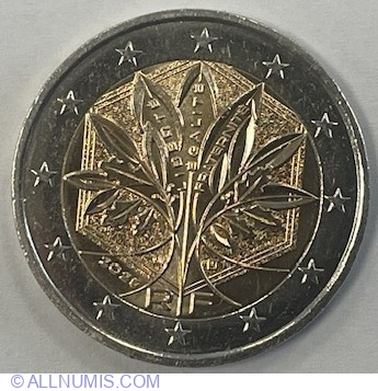| Descriere revers | Decorat cu crenguțe de stejar și măslin, care sunt concepute pentru a întruchipa puterea, înțelepciunea și natura. Fundalul este format dintr-un hexagon, simbolul național al Franței, iar inelul exterior al monedei este decorat cu 12 stele ale drapelului UE. |