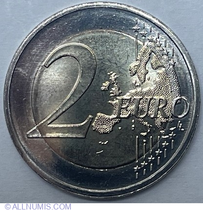 | Descriere avers | În partea stângă, numeralul 2 care indică valoarea nominală; în dreapta se află şase linii paralele verticale; aproape de fiecare dintre extremităţile liniilor apare câte o stea care înterupe linia - în total sunt douăsprezece stele; în dreapta se află harta Europei; partea dreaptă a hărţii este suprapusă peste linii; cuvântul EURO este scris pe orizontală în partea dreaptă, suprapus peste hartă; sub litera O apar iniţialele LL ale gravorului |