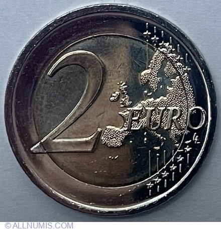 | Descriere avers | În partea stângă, numeralul 2 care indică valoarea nominală; în dreapta se află şase linii paralele verticale; aproape de fiecare dintre extremităţile liniilor apare câte o stea care înterupe linia - în total sunt douăsprezece stele; în dreapta se află harta Europei; partea dreaptă a hărţii este suprapusă peste linii; cuvântul EURO este scris pe orizontală în partea dreaptă, suprapus peste hartă; sub litera O apar iniţialele LL ale gravorului |