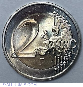 | Descriere avers | În partea stângă, numeralul 2 care indică valoarea nominală; în dreapta se află şase linii paralele verticale; aproape de fiecare dintre extremităţile liniilor apare câte o stea care înterupe linia - în total sunt douăsprezece stele; în dreapta se află harta Europei; partea dreaptă a hărţii este suprapusă peste linii; cuvântul EURO este scris pe orizontală în partea dreaptă, suprapus peste hartă; sub litera O apar iniţialele LL ale gravorului |