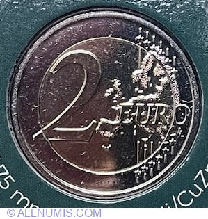 | Descriere avers | În partea stângă, numeralul 2 care indică valoarea nominală; în dreapta se află şase linii paralele verticale; aproape de fiecare dintre extremităţile liniilor apare câte o stea care înterupe linia - în total sunt douăsprezece stele; în dreapta se află harta Europei; partea dreaptă a hărţii este suprapusă peste linii; cuvântul EURO este scris pe orizontală în partea dreaptă, suprapus peste hartă; sub litera O apar iniţialele LL ale gravorului |