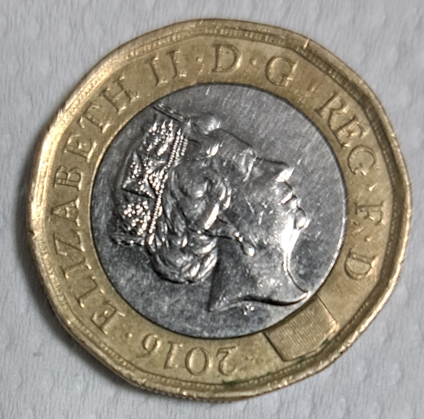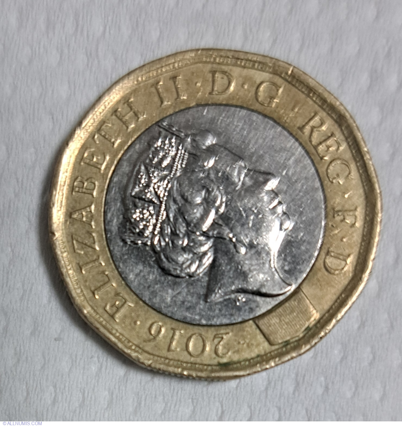 | Descriere avers | Al cincilea portret încoronat al M S Queen Elizabeth II, îndreptat spre dreapta, purtând Diadema de Stat George IV ( Diamond Diadem). Sub bust, inițialele gravorului J.C. Legendă pe inel pe tot conturul : 2016·ELIZABETH II·D·GREG·F·D· (anul emiterii - Elizabeta a II a regină prin harul lui Dumnezeu, apărătoare a credinței ), centrată în partea inferioară la o „imagine latentă” (asemănătoare cu o hologramă, se schimbă între un semn 1 și un semn £, pe măsură ce se rotește moneda). Lângă muchie, pe fiecare latură, microlegendă incusă: ONE POUND·ONE POUND. |