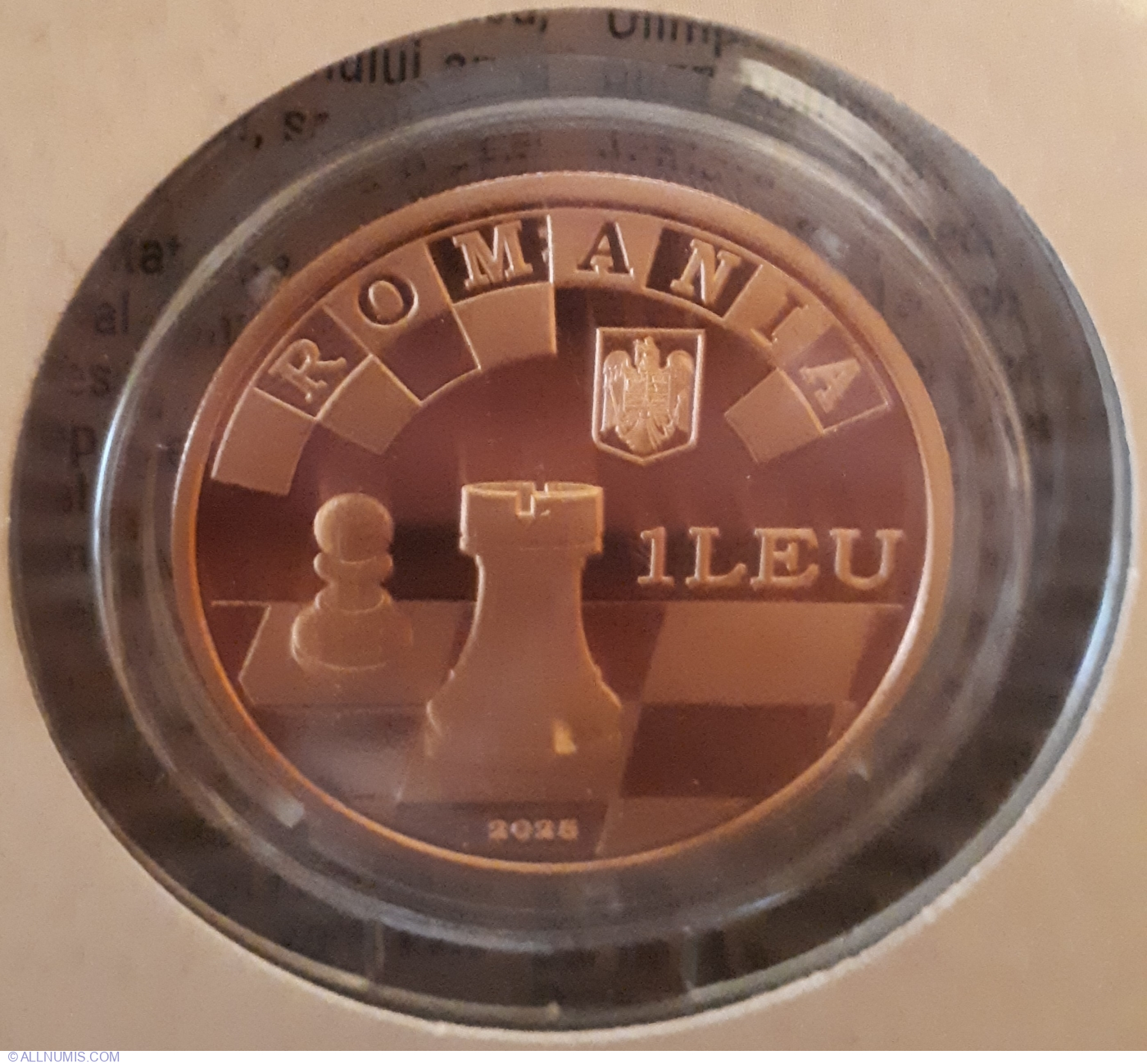 | Descriere avers | O tura si un pion pe o tabla de sah alaturi de inscriptiile: ROMANIA, 1 LEU valoarea nominala, 2025 si stema Romaniei. |