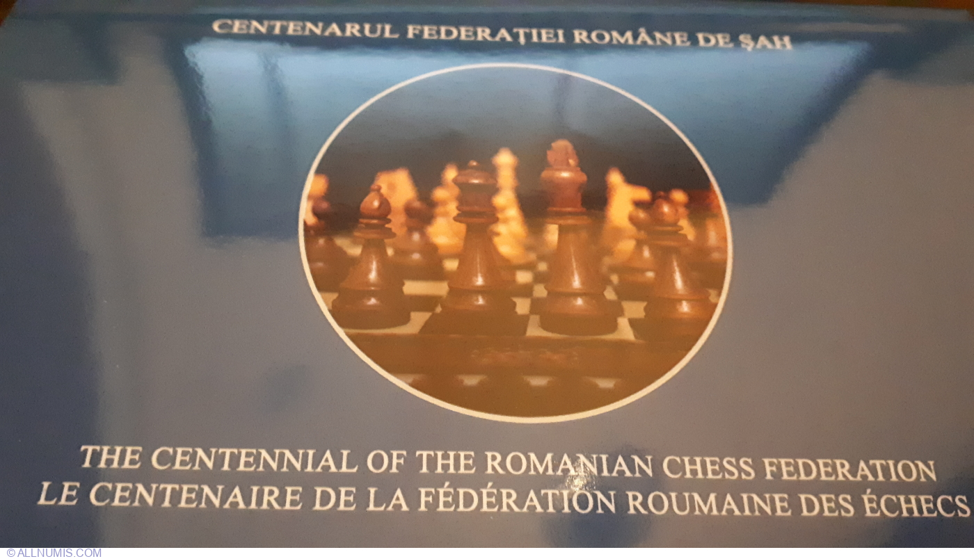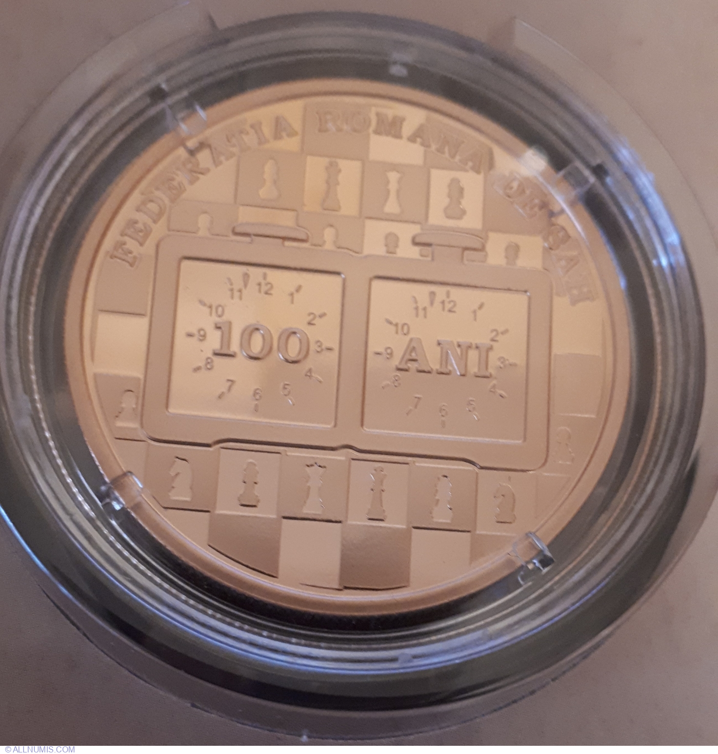 | Descriere generală | Moneda de tombac cuprat emisa pentru a celebra Centenarul Federatiei Romane de Sah. |