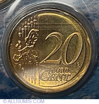 | Descriere avers | În partea dreaptă, numeralul 20 care indică valoarea nominală; sub numeral, cuvintele EURO şi CENT, unul sub celălalt; cuvântul CENT este scris cu litere mai mari decât cele folosite pentru cuvântul EURO, iar litera C este mai mare decât celelalte litere ale cuvântului; în stânga se află şase linii paralele verticale; aproape de fiecare dintre extremităţile liniilor apare câte o stea care înterupe linia - în total sunt douăsprezece stele; peste linii, la mijloc, este suprapusă harta Europei; în partea din dreapta-jos apar iniţialele LL ale gravorului. |