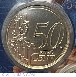 Descriere avers | În partea dreaptă, numeralul 50 care indică valoarea nominală; sub numeral, cuvintele EURO şi CENT, unul sub celălalt; cuvântul CENT este scris cu litere mai mari decât cele folosite pentru cuvântul EURO, iar litera C este mai mare decât celelalte litere ale cuvântului; în stânga se află şase linii paralele verticale; aproape de fiecare dintre extremităţile liniilor apare câte o stea care înterupe linia - în total sunt douăsprezece stele; peste linii, la mijloc, este suprapusă harta Europei; în partea din dreapta-jos apar iniţialele LL ale gravorului |