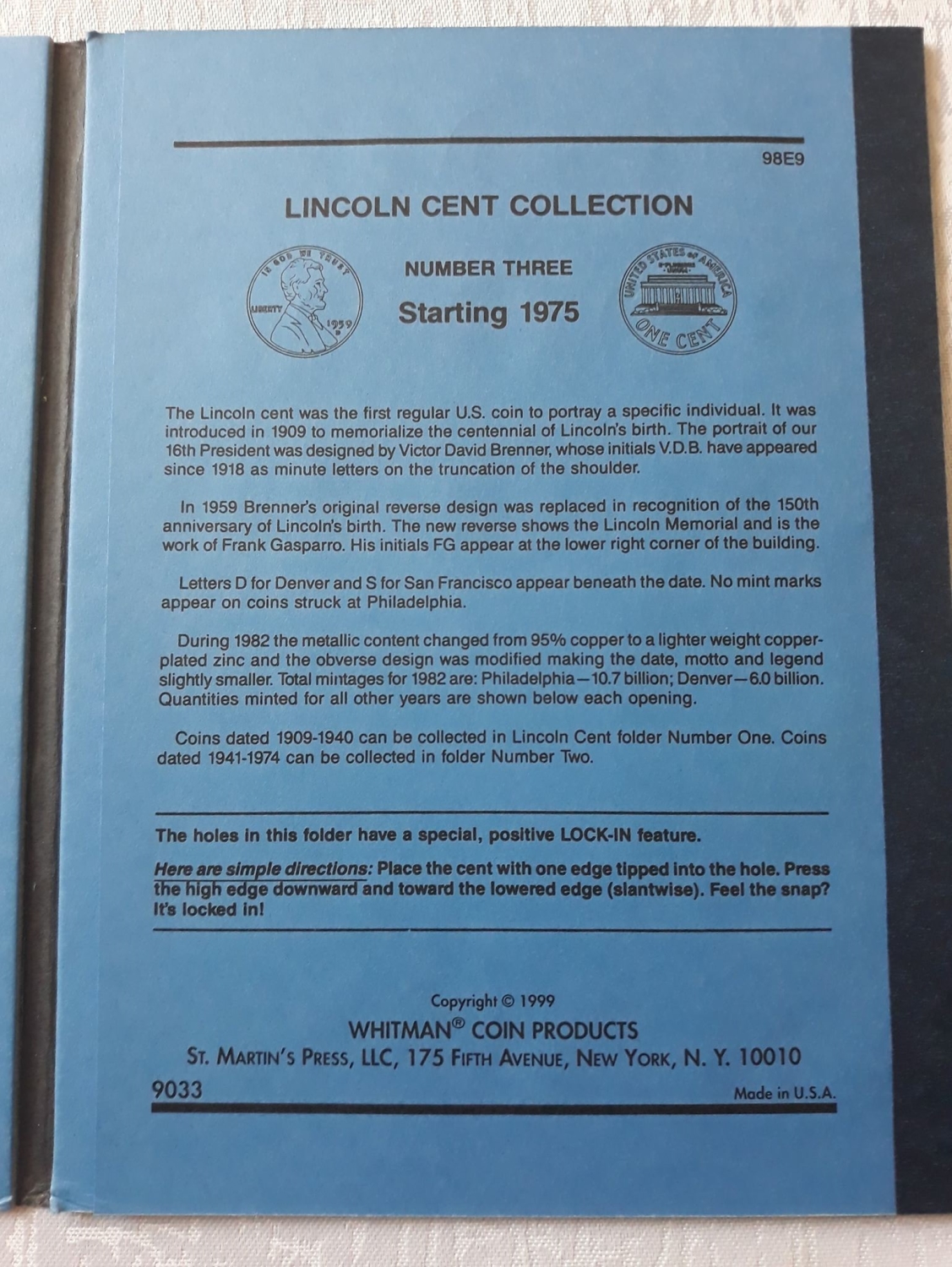 Acest dosar de monede Whitman conține modelele Lincoln care au fost introduse în 1975.